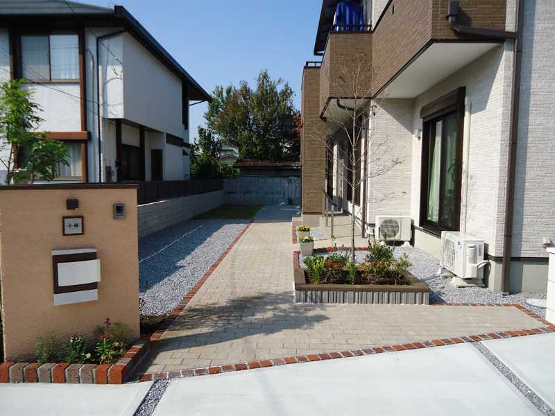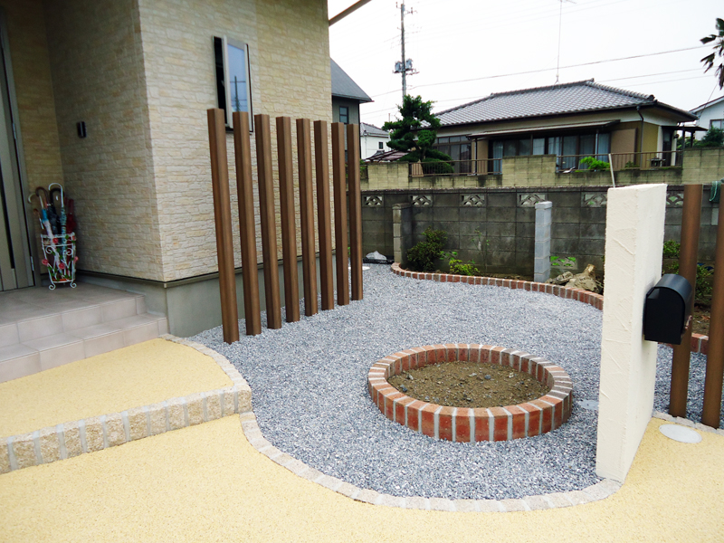 アプローチの距離に限りが有りましたので、単調に成るのを避けるため門柱を2つ立てました。