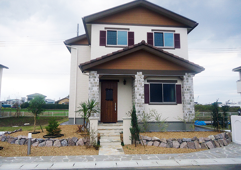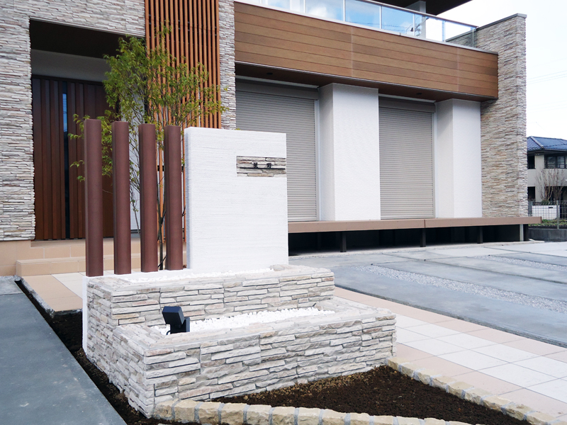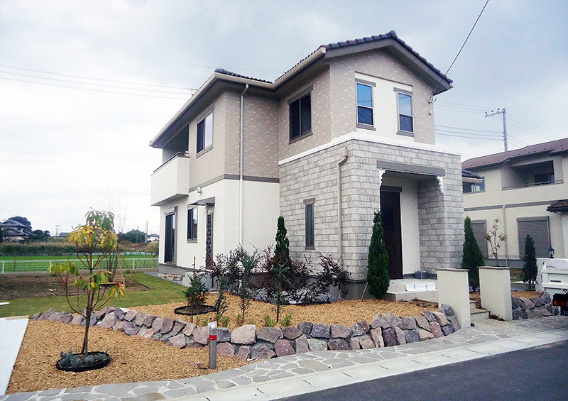 石垣の土留めが個性を発揮・南欧風の外構をもり立てます。