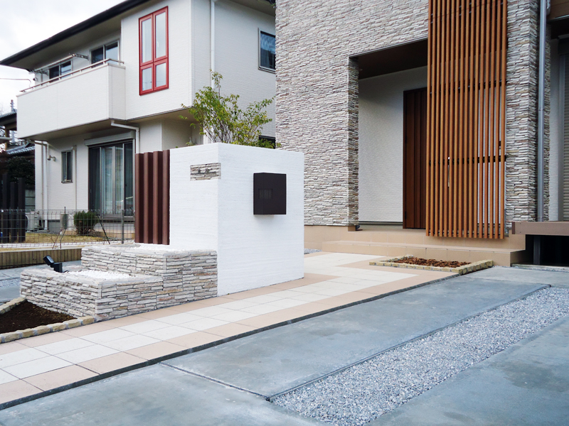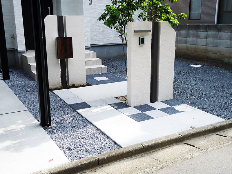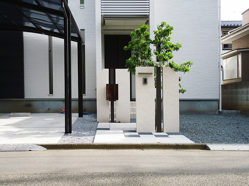 全体的に白と黒を基調としておりますので、無機質に成りがちですが、前方の門柱の後ろに植樹、後方の門柱の前には植栽スペースを設けさせて頂きました。