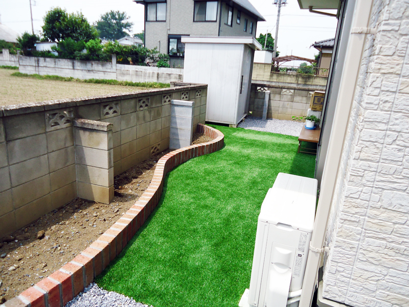 裏の御庭に回れば、お手入れが大変な天然芝生ではなく人工芝生を植えました。