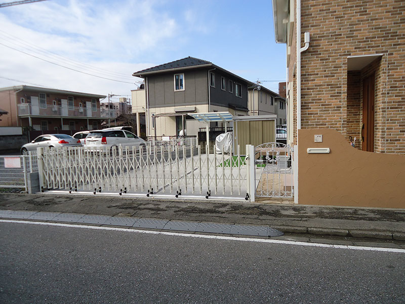 レンガ風のお家に組み込まれた白いサッシ その白に合わせた門扉